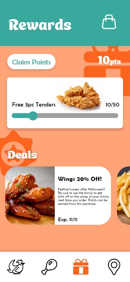 The goal with Rooster's Den was to better understand how fastfood chains like McDonalds and Starbucks create mobile interfaces in order to encourage user retention. After researching and testing various fastfood mobile apps from start to checkout, I found that there were many shared traits between them. For example, most mobile fastfood apps have some kind of reward system that encourages users to order online for deals and rewards. Another trait many of them shared was that most options and buttons to click on will inevitably funnel users into the menu, which then takes you to check out once an item is added; this makes it difficult to get lost and potentially lose user retention due to frustration..